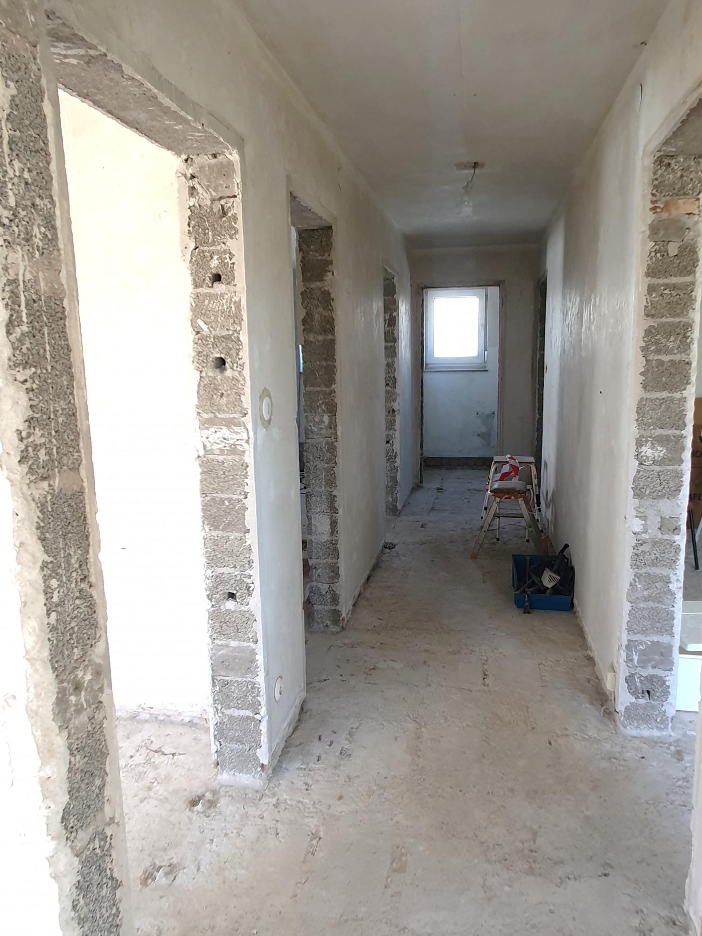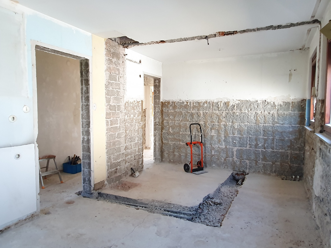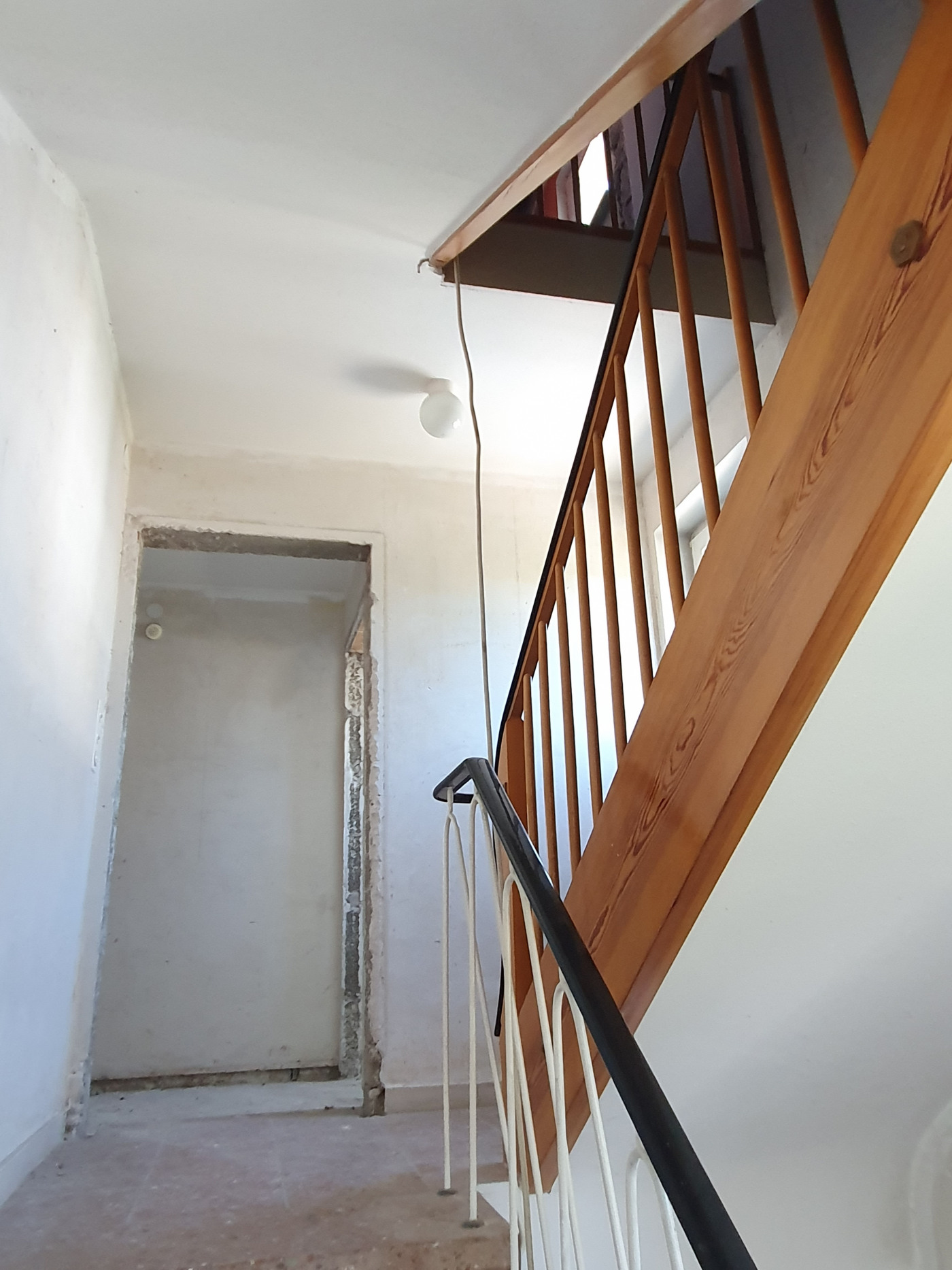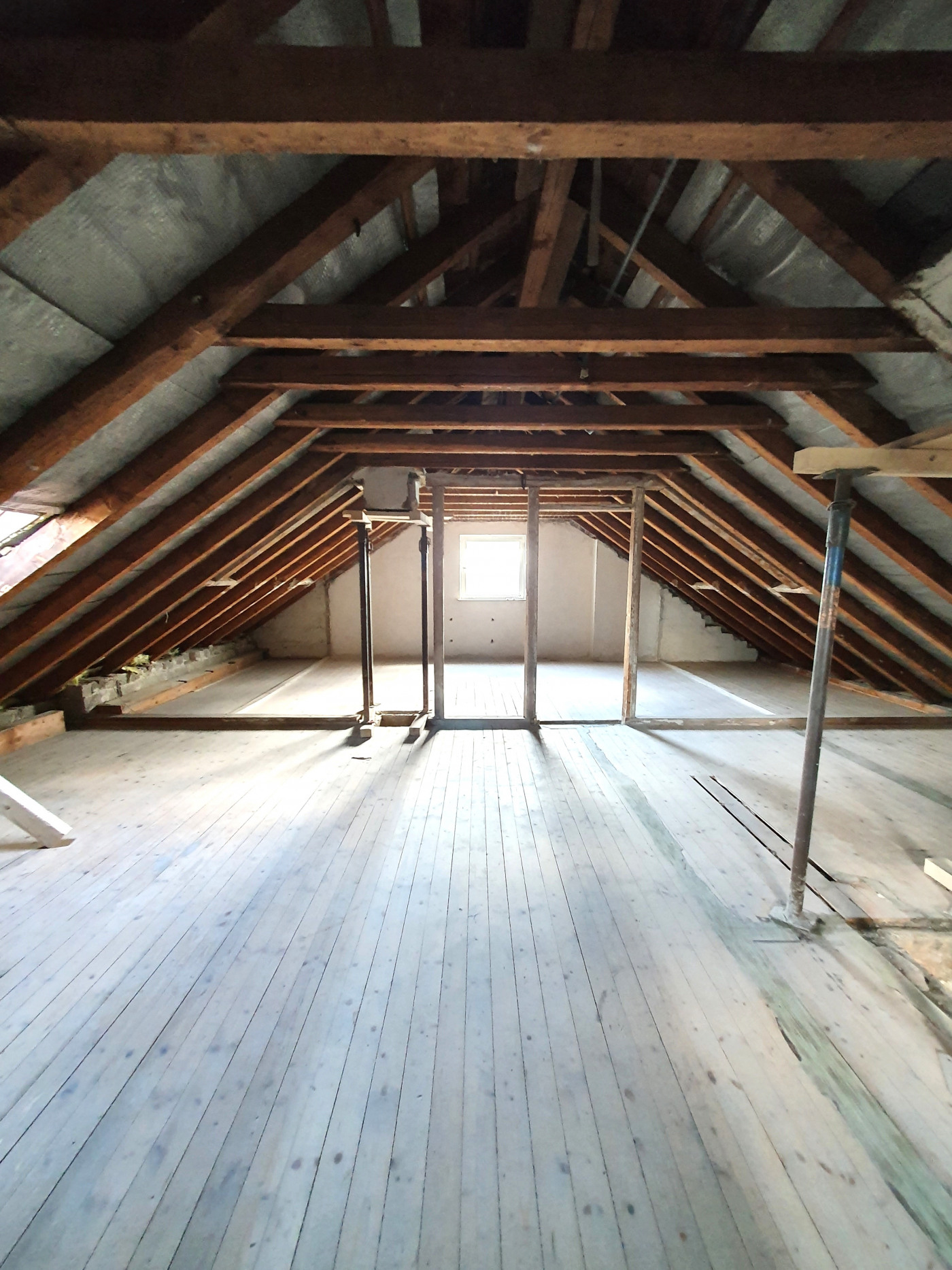 Im Dachgeschoss ist derzeit lediglich die Wand zum Treppenhaus erhalten geblieben. Alle weiteren Innenwände wurden vollständig entfernt, sodass ein großzügiger, offener Raum entstanden ist, der vielfältige Möglichkeiten zur individuellen Gestaltung bietet.