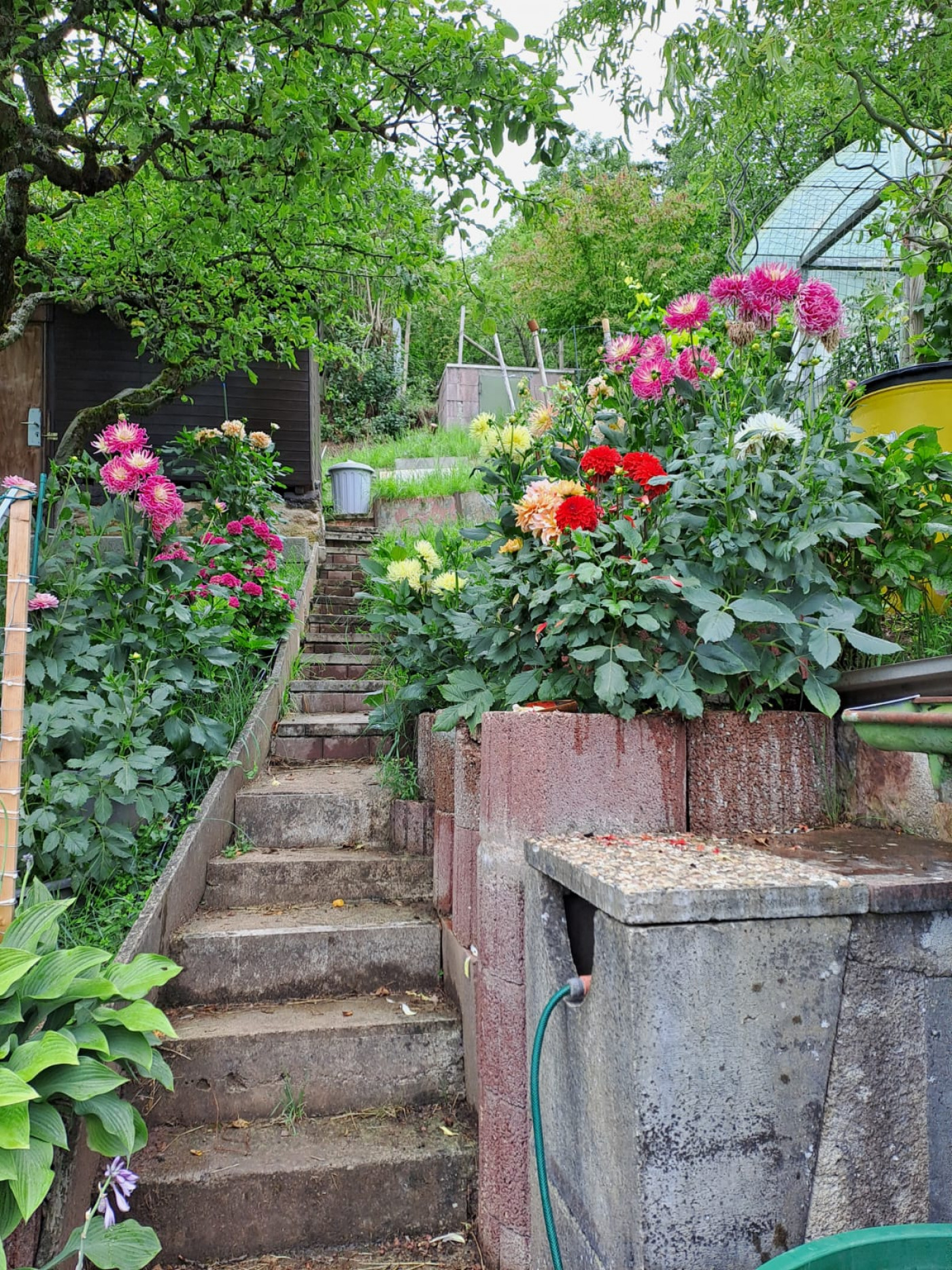 Schattenmorellen, Süsskirschenbäume, Hedelfinger Kirsche, Quitte, Birne, Apfel ( James Greev, Brettacher, Klara,)Mirabelle Tomaten, Gurken, Erdbeeren, Paprika, Pepperoni, Pampasgras, Zwetschgen, Haselnuss, Farn, Hortensie