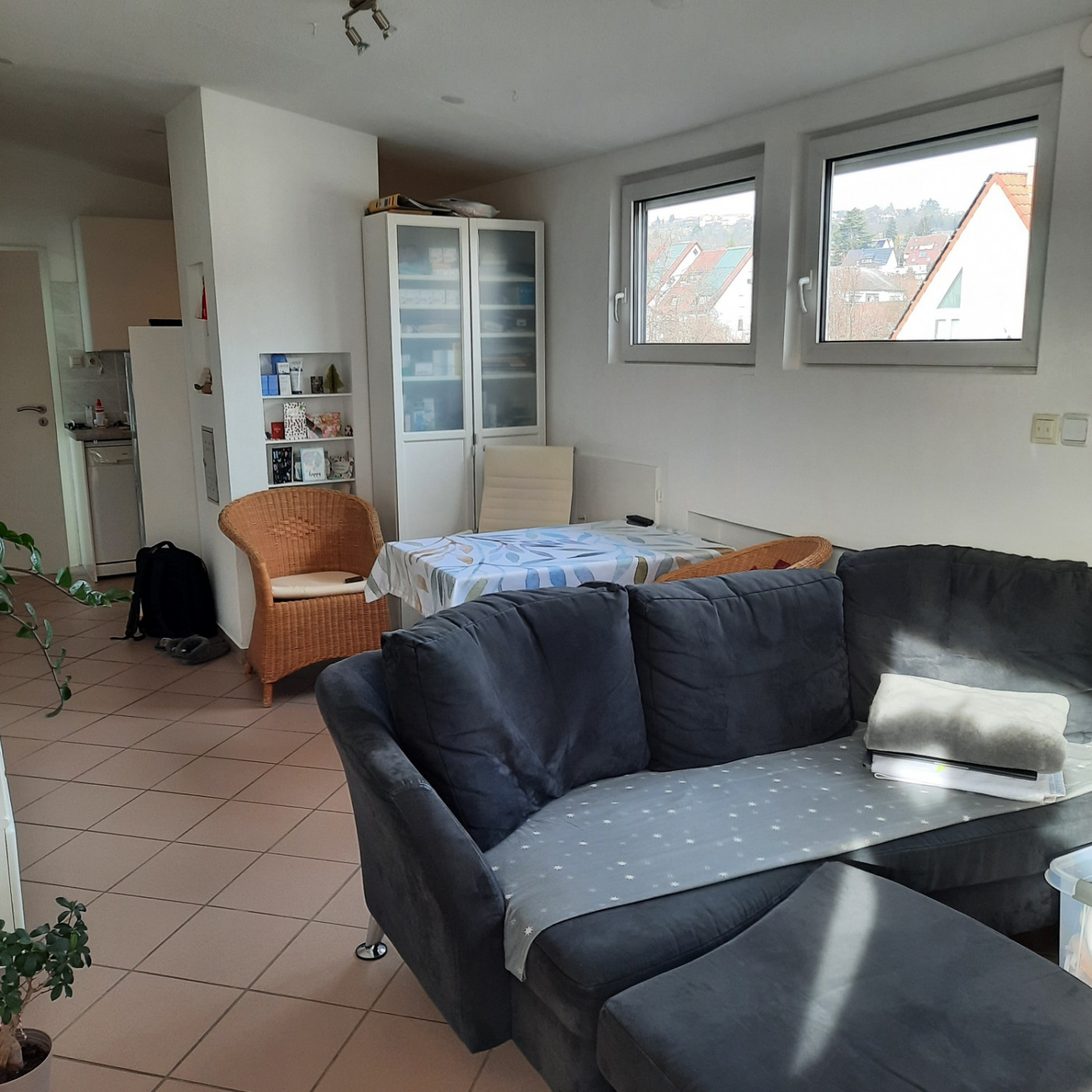 Die Wohnung besticht durch ein lichtdurchflutetes Wohn-/Esszimmer mit Fliesenboden, das eine einladende Atmosphäre schafft.