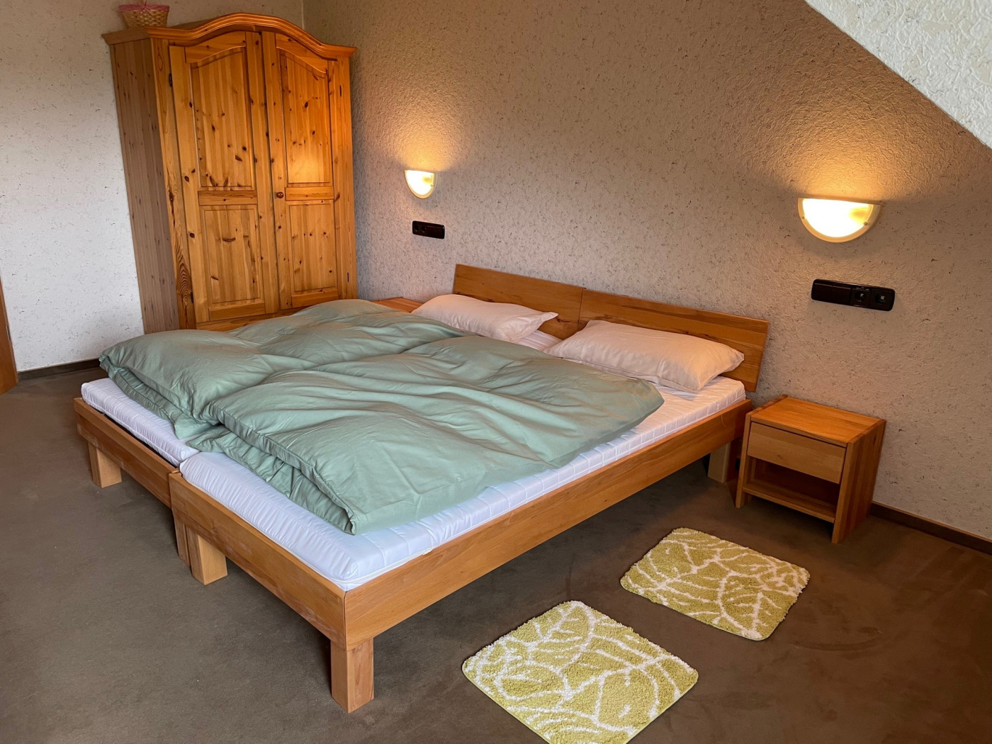 Im 1 OG befinden sich zwei Schlafzimmer mit je einem Doppelbett (180x200cm) und einem Kleiderschrank und Nachtkästchen, ausgelegt sind sie mit Teppichboden.