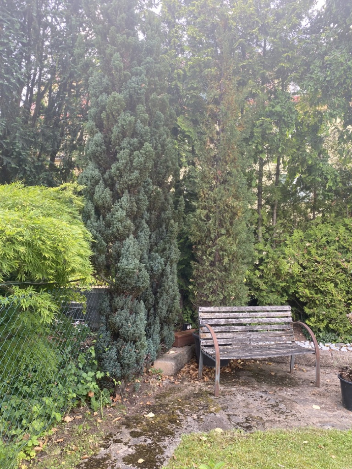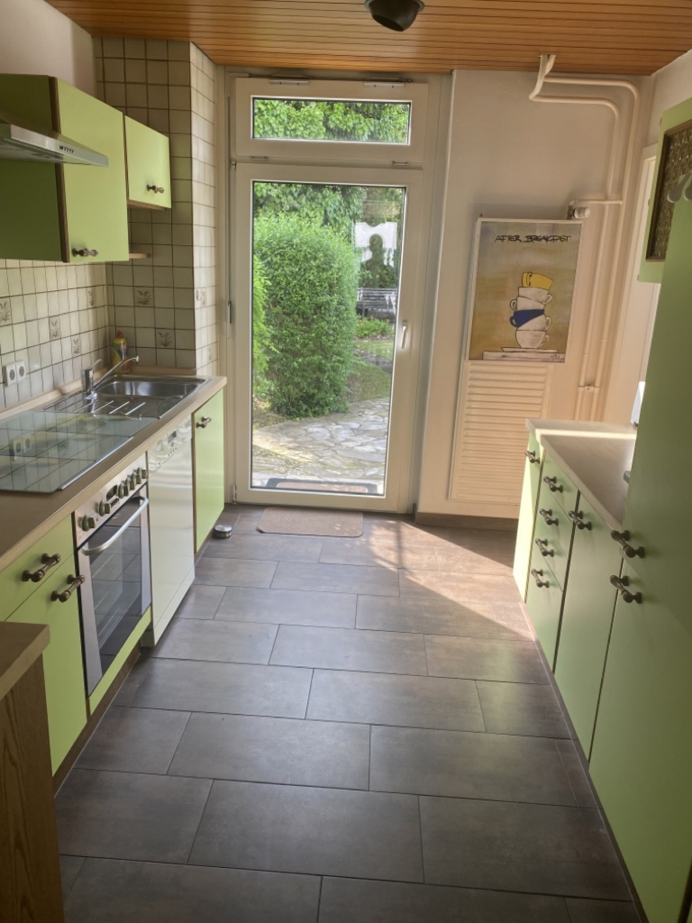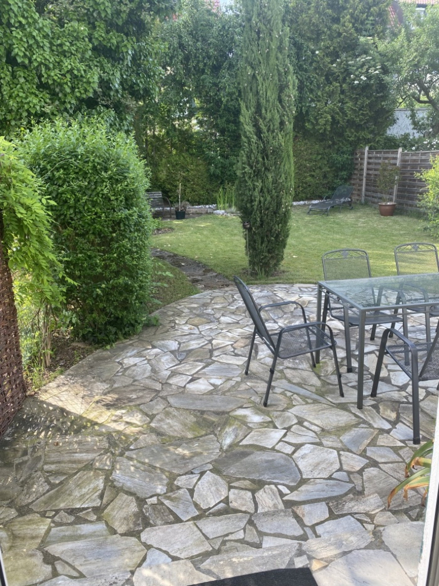 Durch die Küche gelangt man auf die Rückseite des Hauses auf eine mit Naturstein gepflasterte Terrasse und in einen schön angelegten Garten.